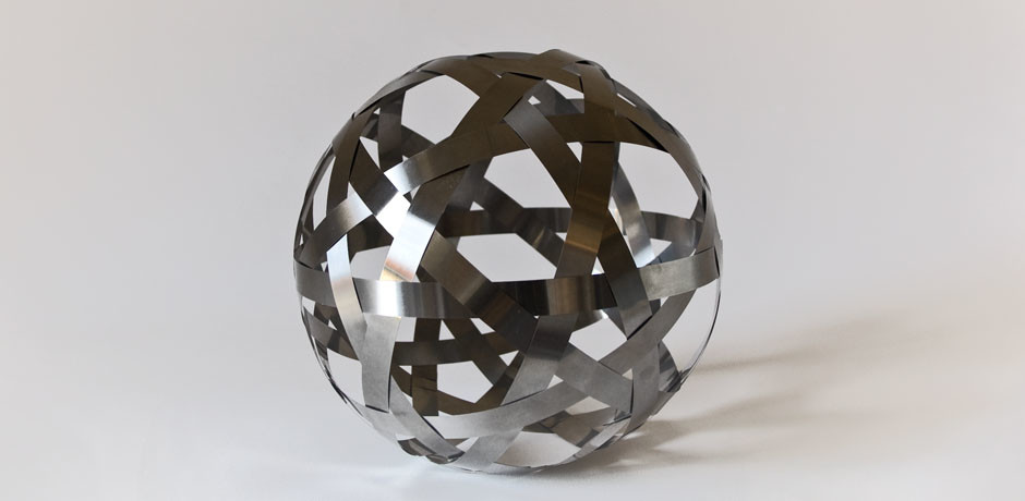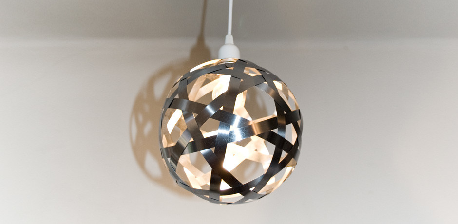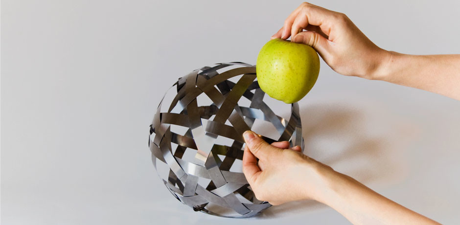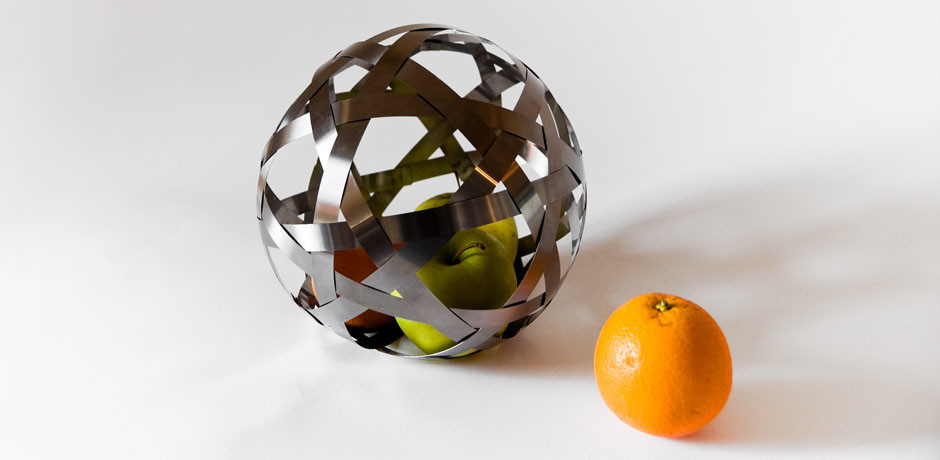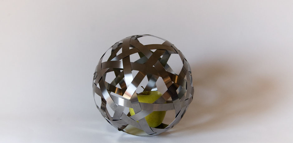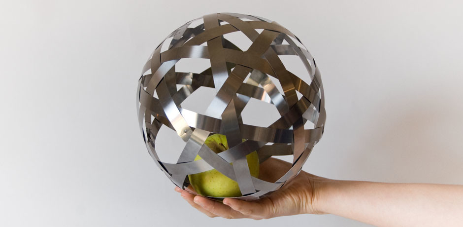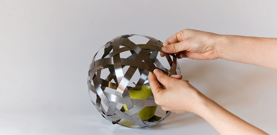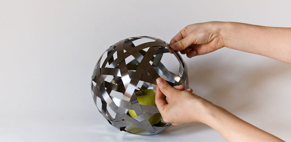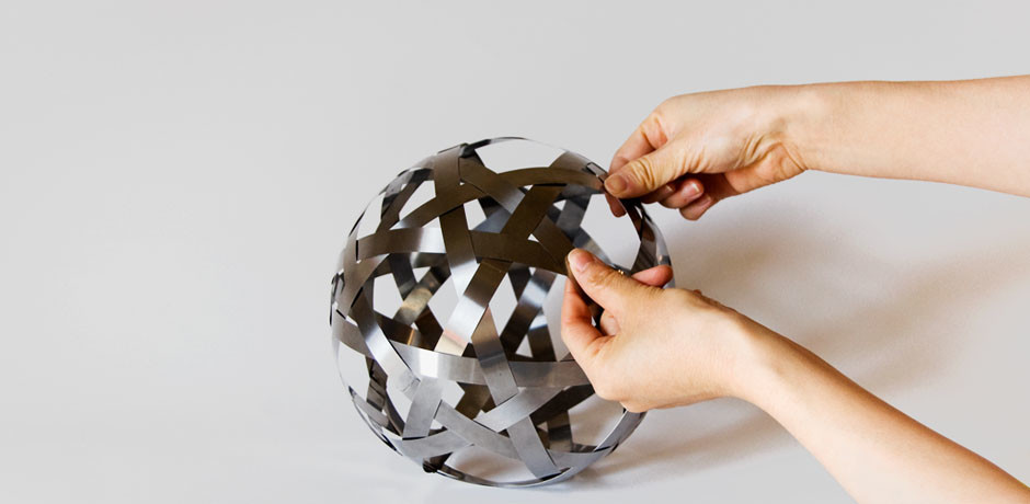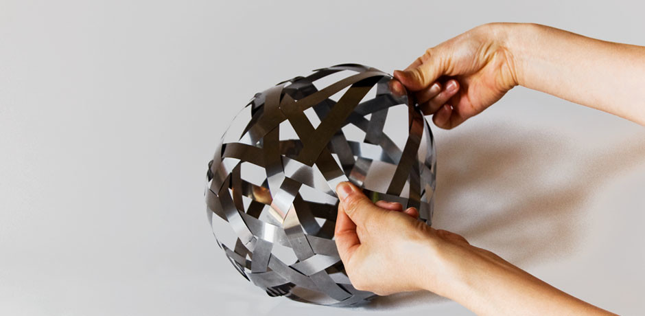 KOSMOS is a “sphere container” made from metal strips. The gaps between strips can be stretched with hands to make the gap bigger. After you put your things in the sphere, you can closed back the gap to the original position. Your objects remain inside the sphere. Making use of the adjusting gap, it also can be used as a “pendant lampshade” putting a light bulb inside the sphere.